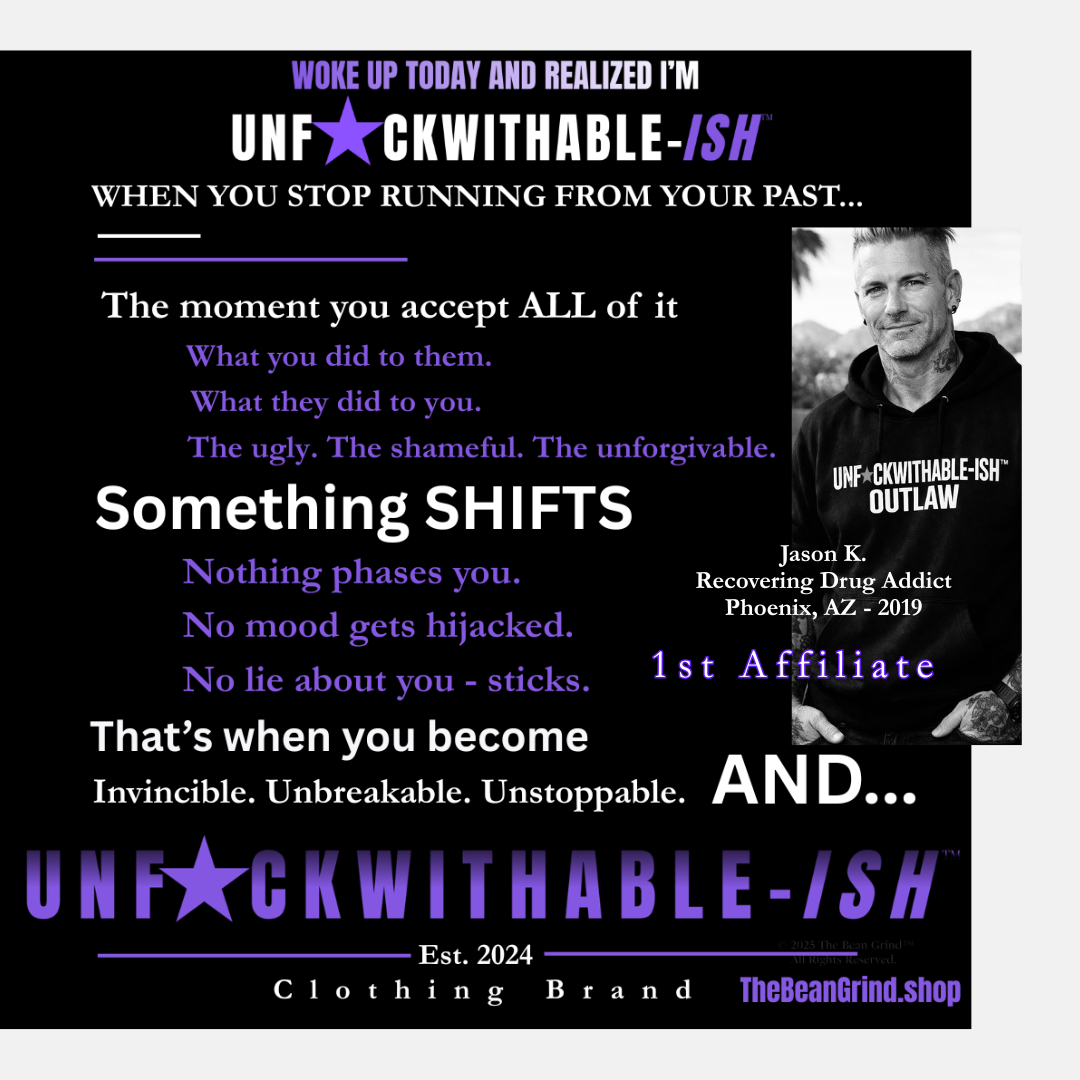 Hey Friends! Welcome home! What's in here? Well, The Bean Grind has a little bit of everything for everyone, sober or not. If you're here to earn some cash with our Affiliate Team (HOPE DEALERS) and get your free website built, grab UNF★CKWITHABLE-ISH™ & sober merch or free digital downloads, well guess what? You’re home. Don't forget to meet BeanJamin, the ONLY sober ChatGPT alive. Now just one time $5.99 to adopt him forever (must have OpenAI ChatGPT app to use him). If you want the crazier than a Hollywood movie, backstory that started it all, read my recovery story.