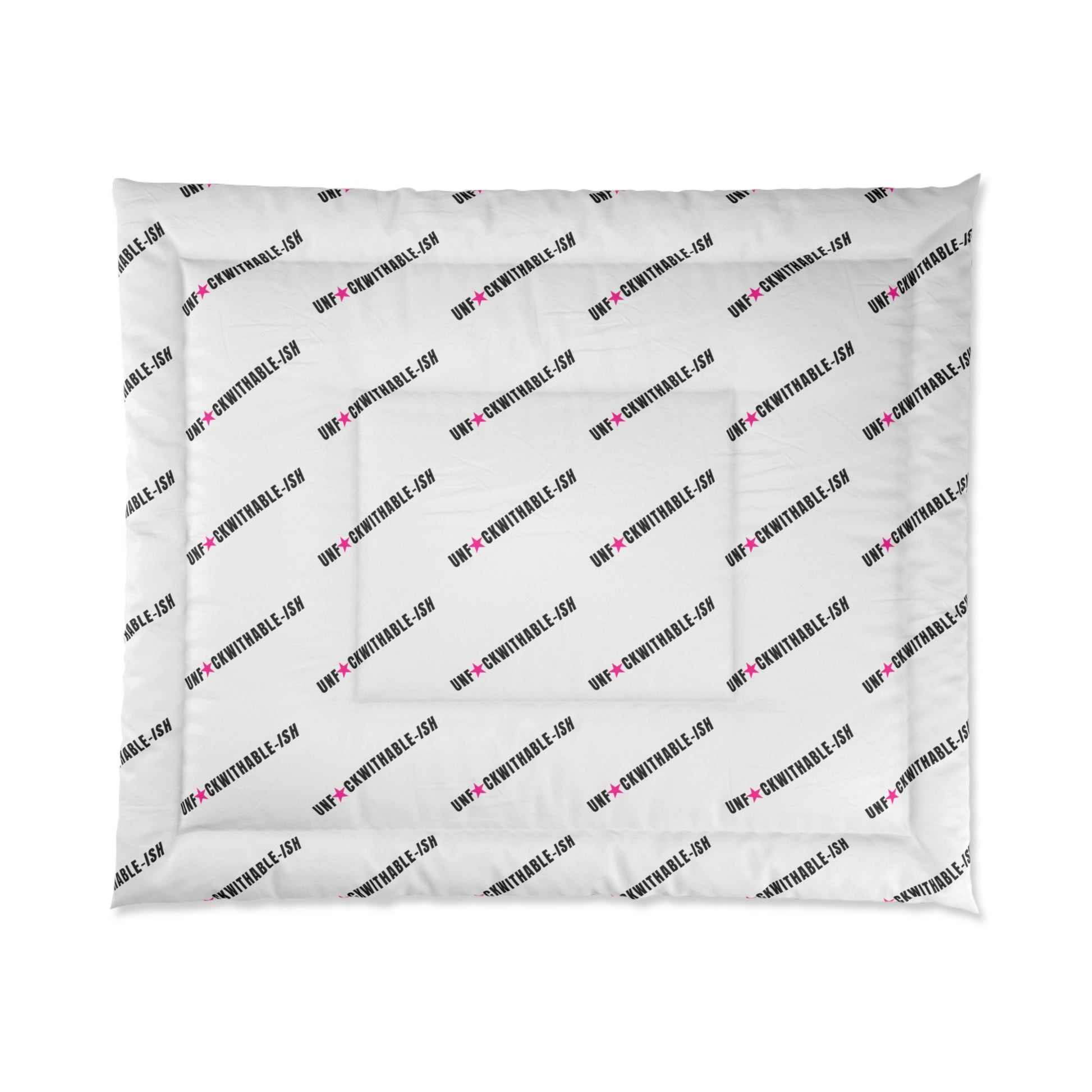 Branded Repeat Logo Comforter — Custom Patterned Bedding with Diagonal Text This lightweight comforter wraps a bedroom in quiet, modern rhythm. The crisp white background and diagonal repeating motif create a clean, graphic statement without overwhelming the room. Soft microfiber polyester gives it a smooth hand and gentle drape, while the double square quilting keeps the lofted batting evenly distributed for consistent warmth. It layers easily over sheets or a duvet cover and brightens minimalist or contemporary spaces with a subtle pattern and pops of color. Use it to update a guest room, refresh a rental space, or bring a fresh feel to weeknight bedding — easy to style, easy to live with.